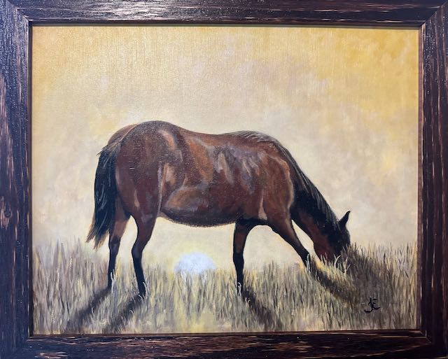 Description: I have been wanting to do a painting of a horse for a long time. I finally took a good base picture of a horse. I was trying to keep the painting simple to really emphasize the beauty of the horse. The frame is handcrafted in cedar and stained to pick up the tones of the horse.