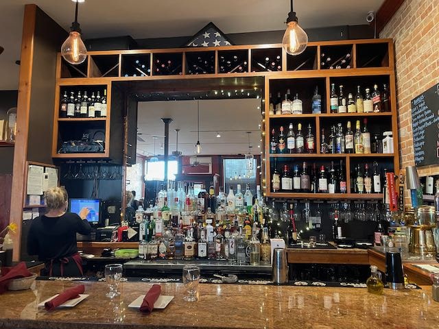 Description: Atmospheric photograph of a cozy restaurant bar in Maine. Warm, inviting interior shot perfect for restaurant decor, hospitality spaces, or coastal home bars.