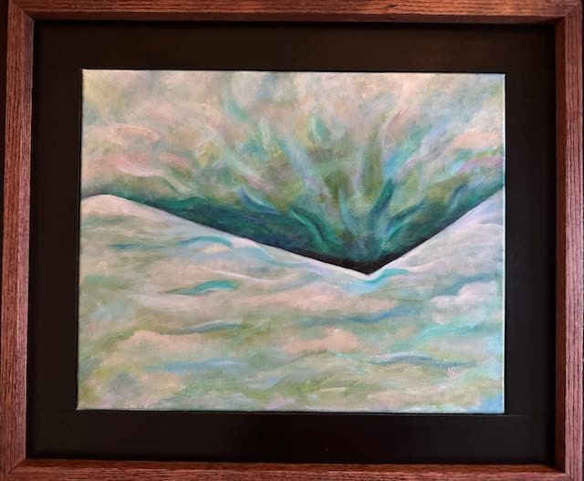 Description: This is a painting representing how energy flows under and over our lives, thoughts, and emotions. The frame is handcrafted in red oak.
