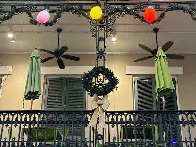 Description: Vibrant green umbrellas create a charming outdoor dining scene in New Orleans. Colorful patio photography capturing Southern charm and relaxed cafe culture. Perfect for kitchen or dining room decor.