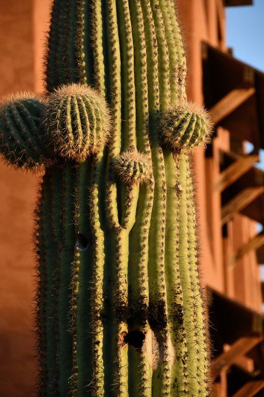 Desert cactus contrasted against modern Phoenix architecture. Urban Southwest photography blending nature with city life. Perfect for contemporary or desert-modern spaces.