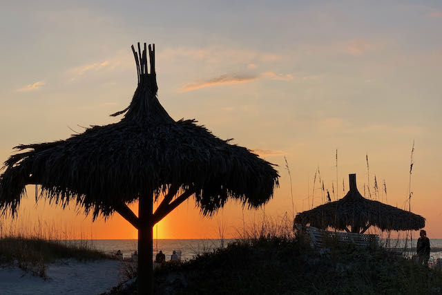 Description: Tropical paradise sunset with tiki huts silhouetted against vibrant sky. Florida beach photography perfect for coastal decor, beach house, or bringing island vibes indoors.