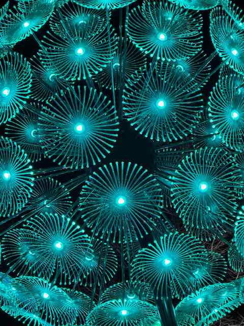 Description: Vibrant teal decorative lights glowing in New Orleans. Moody atmospheric photography perfect for adding colorful ambiance and bohemian flair to any space.
