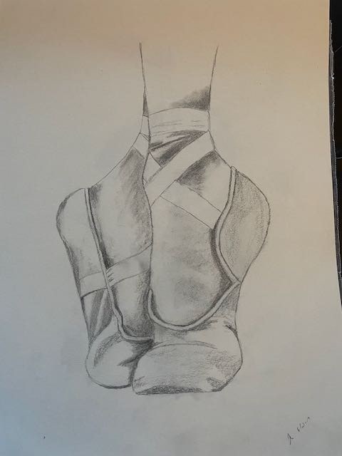 Description: Delicate pencil drawing of ballet shoes with ribbons. Elegant dance art perfect for dancers, studios, or girls' rooms celebrating the grace of ballet.
